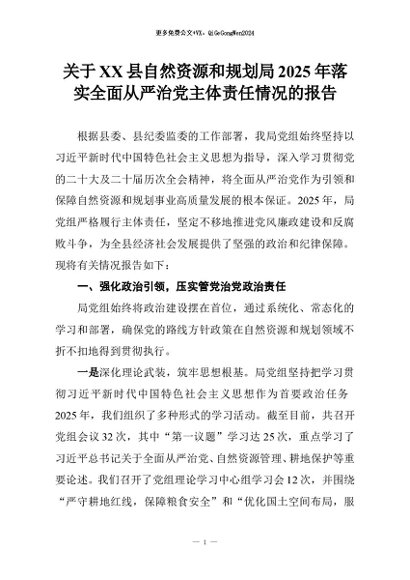【七哥公文】2025年:关于XX县自然资源和规划局2025年落实全面从严治党主体责任情况的报告+更多免费公文+VX:QiGeGongWen2024