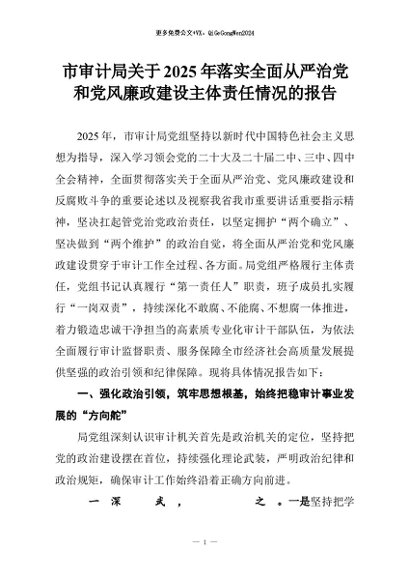 【七哥公文】2025年:市审计局关于2025年落实全面从严治党和党风廉政建设主体责任情况的报告+更多免费公文+VX:QiGeGongWen2024