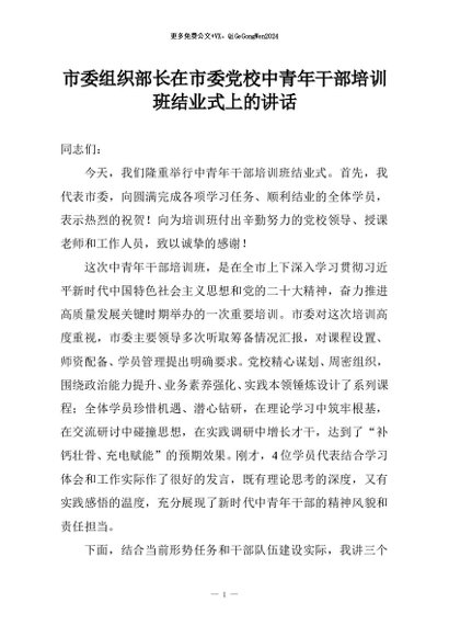 【七哥公文】2025年:市委组织部长在市委党校中青年干部培训班结业式上的讲话+更多免费公文+VX:QiGeGongWen2024