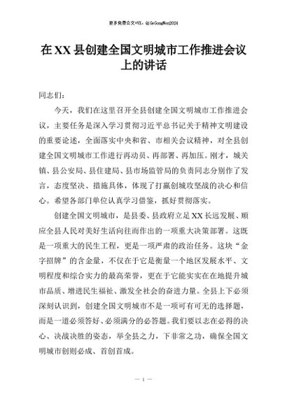 / 【七哥公文】2025年:在XX县创建全国文明城市工作推进会议上的讲话+更多免费公文+VX:QiGeGongWen2024