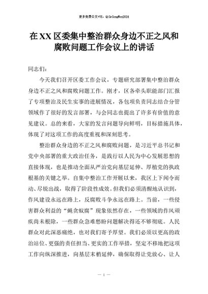 【七哥公文】2025年:在XX区委集中整治群众身边不正之风和腐败问题工作会议上的讲话+更多免费公文+VX:QiGeGongWen2024