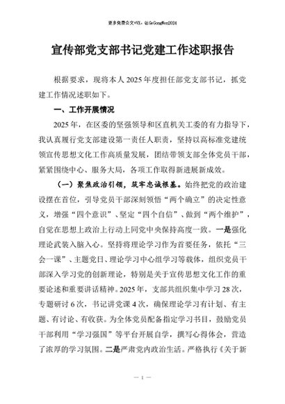 / 【七哥公文】2025年:宣传部党支部书记党建工作述职报告+更多免费公文+VX:QiGeGongWen2024