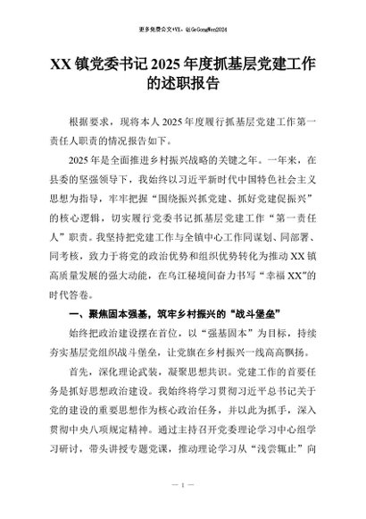 【七哥公文】2025年:XX镇党委书记2025年度抓基层党建工作的述职报告+更多免费公文+VX:QiGeGongWen2024