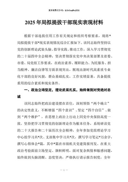 / 【七哥公文】2025年:2025年局拟提拔干部现实表现材料+更多免费公文+VX:QiGeGongWen2024