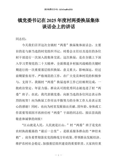 【七哥公文】2025年:镇党委书记在2025年度村两委换届集体谈话会上的讲话+更多免费公文+VX:QiGeGongWen2024