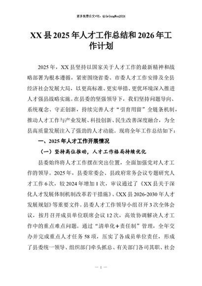 / 【七哥公文】2025年:XX县2025年人才工作总结和2026年工作计划+更多免费公文+VX:QiGeGongWen2024