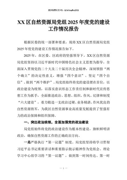 【七哥公文】2025年:XX区自然资源局党组2025年度党的建设工作情况报告+更多免费公文+VX:QiGeGongWen2024
