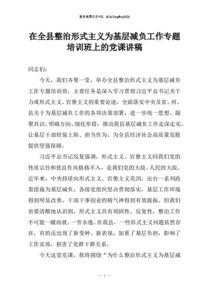 【七哥公文】2025年:在全县整治形式主义为基层减负工作专题培训班上的党课讲稿+更多免费公文+VX:QiGeGongWen2024