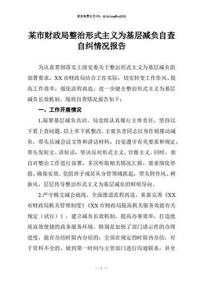 / 【七哥公文】2025年:某市财政局整治形式主义为基层减负自查自纠情况报告+更多免费公文+VX:QiGeGongWen2024