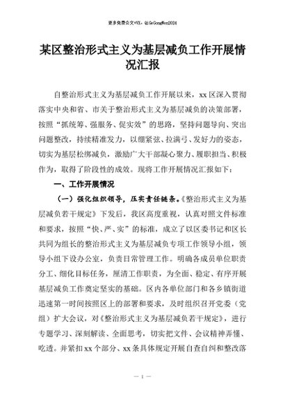 / 【七哥公文】2025年:某区整治形式主义为基层减负工作开展情况汇报+更多免费公文+VX:QiGeGongWen2024