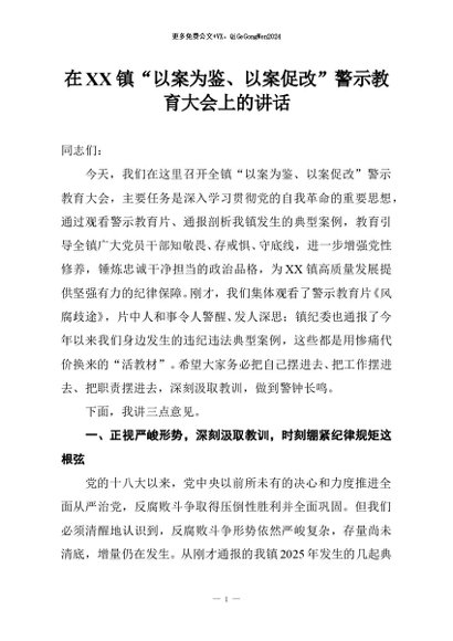 / 【七哥公文】2025年:在XX镇“以案为鉴、以案促改”警示教育大会上的讲话+更多免费公文+VX:QiGeGongWen2024