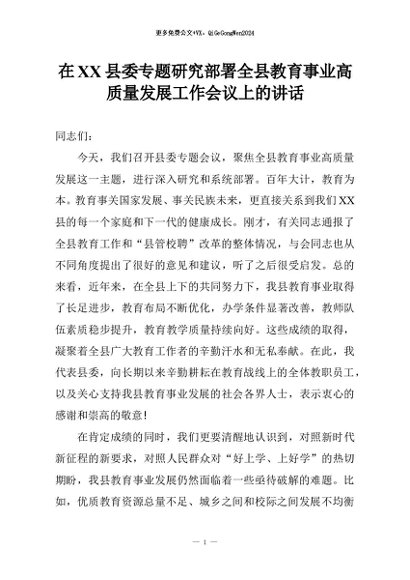 【七哥公文】2025年:在XX县委专题研究部署全县教育事业高质量发展工作会议上的讲话+更多免费公文+VX:QiGeGongWen2024