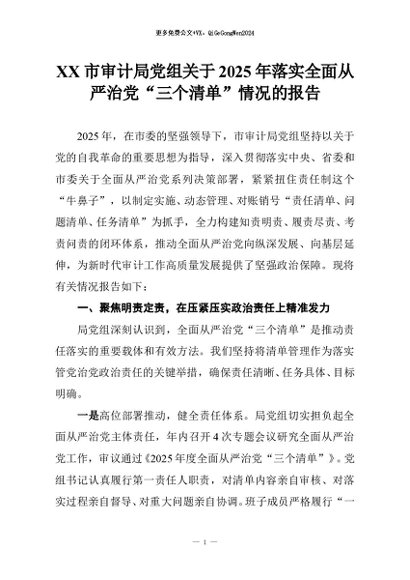 【七哥公文】2025年:XX市审计局党组关于2025年落实全面从严治党“三个清单”情况的报告+更多免费公文+VX:QiGeGongWen2024