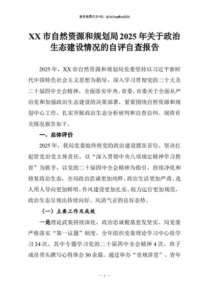 【七哥公文】2025年:XX市自然资源和规划局2025年关于政治生态建设情况的自评自查报告+更多免费公文+VX:QiGeGongWen2024