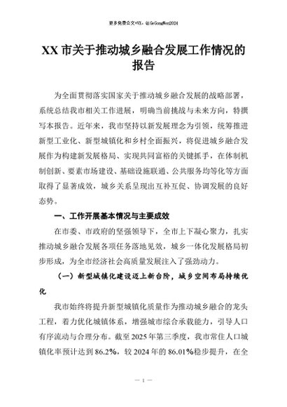 / 【七哥公文】2025年:XX市关于推动城乡融合发展工作情况的报告+更多免费公文+VX:QiGeGongWen2024