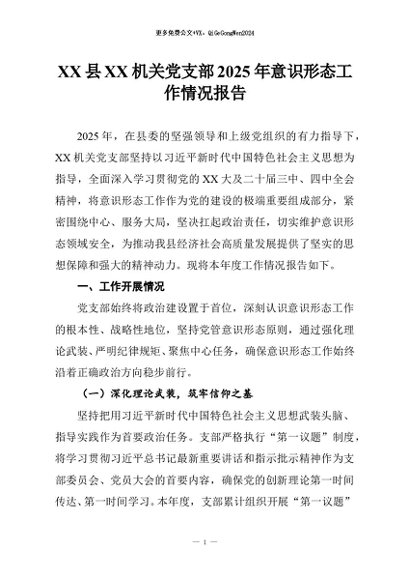 【七哥公文】2025年:XX县XX机关党支部2025年意识形态工作情况报告+更多免费公文+VX:QiGeGongWen2024