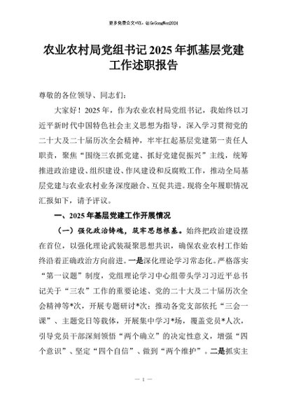 / 【七哥公文】2025年:农业农村局党组书记2025年抓基层党建工作述职报告+更多免费公文+VX:QiGeGongWen2024
