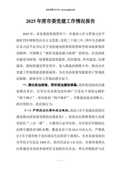 / 【七哥公文】2025年:2025年度市委党建工作情况报告+更多免费公文+VX:QiGeGongWen2024