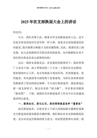 【七哥公文】2025年:2025年在支部换届大会上的讲话+更多免费公文+VX:QiGeGongWen2024
