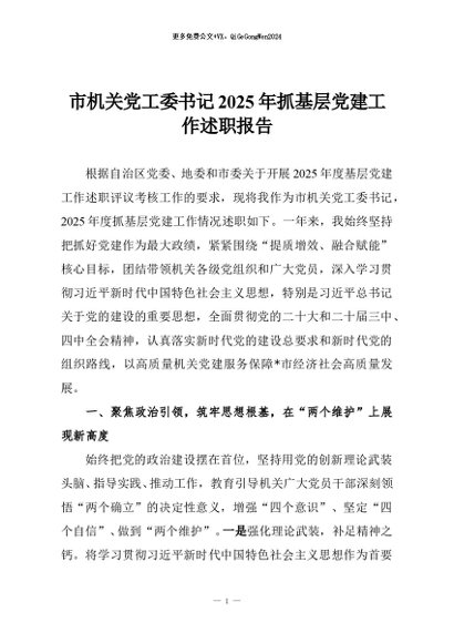 / 【七哥公文】2025年:市机关党工委书记2025年抓基层党建工作述职报告+更多免费公文+VX:QiGeGongWen2024