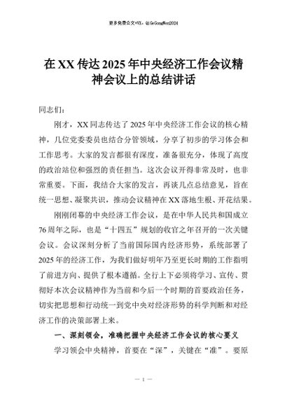 【七哥公文】2025年:在XX传达2025年中央经济工作会议精神会议上的总结讲话+更多免费公文+VX:QiGeGongWen2024