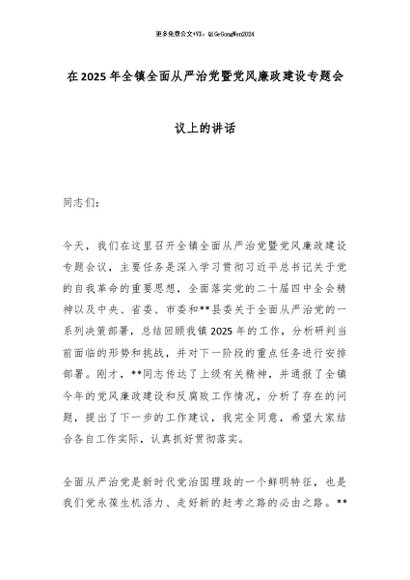 【七哥公文】2025年:在2025年全镇全面从严治党暨党风廉政建设专题会议上的讲话_副本+更多免费公文+VX:QiGeGongWen2024