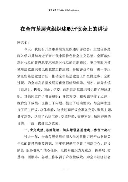 / 【七哥公文】2025年:在全市基层党组织述职评议会上的讲话+更多免费公文+VX:QiGeGongWen2024
