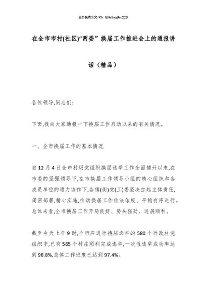 【七哥公文】2025年:在全市市村(社区)“两委”换届工作推进会上的通报讲话(精品)_副本+更多免费公文+VX:QiGeGongWen2024
