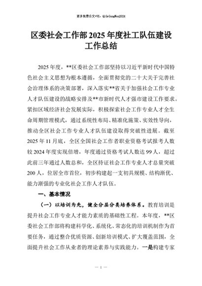 / 【七哥公文】2025年:区委社会工作部2025年度社工队伍建设工作总结+更多免费公文+VX:QiGeGongWen2024