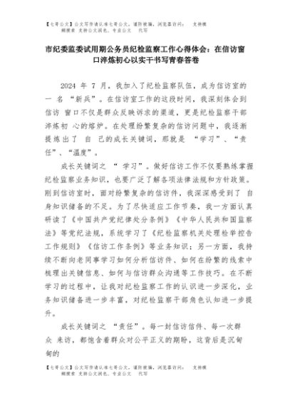【七哥公文】2025年:市纪委监委试用期公务员纪检监察工作心得体会:在信访窗口淬炼初心 以实干书写青春答卷+更多免费公文+VX:QiGeGongWen2024