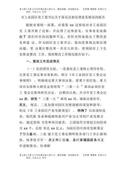 【七哥公文】2025年:市工业园区党工委书记关于落实巡察反馈意见情况的报告+更多免费公文+VX:QiGeGongWen2024