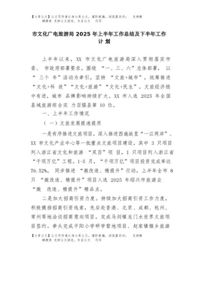 【七哥公文】2025年:市文化广电旅游局2025年上半年工作总结及下半年工作计划+更多免费公文+VX:QiGeGongWen2024