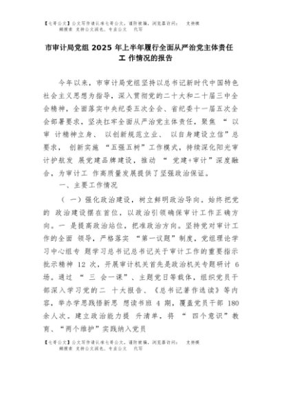 【七哥公文】2025年:市审计局党组2025年上半年履行全面从严治党主体责任工作情况的报告+更多免费公文+VX:QiGeGongWen2024