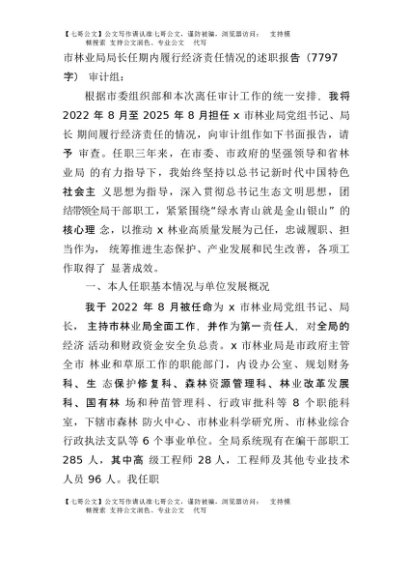 【七哥公文】2025年:市林业局局长任期内履行经济责任情况的述职报告(7797字)+更多免费公文+VX:QiGeGongWen2024