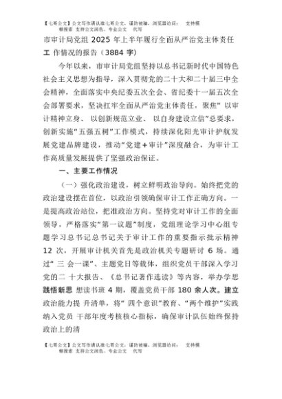【七哥公文】2025年:市审计局党组2025年上半年履行全面从严治党主体责任工作情况的报告(3884字)+更多免费公文+VX:QiGeGongWen2024