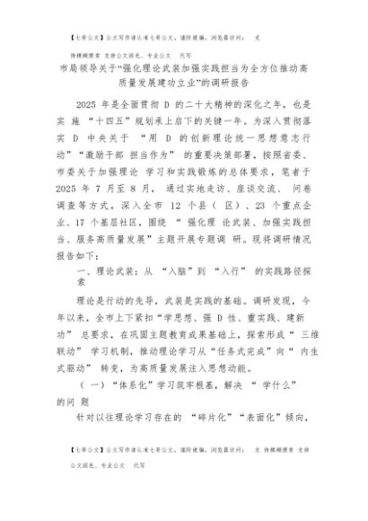 【七哥公文】2025年:市局领导关于“强化理论武装加强实践担当为全方位推动高质量发展建功立业”的调研报告+更多免费公文+VX:QiGeGongWen2024