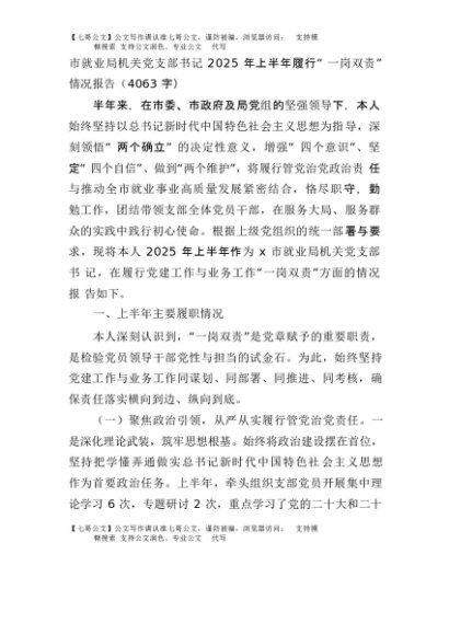 【七哥公文】2025年:市就业局机关党支部书记2025年上半年履行“一岗双责”情况报告(4063字)+更多免费公文+VX:QiGeGongWen2024
