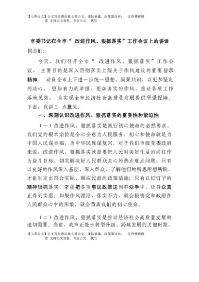 【七哥公文】2025年:市委书记在全市“改进作风、狠抓落实”工作会议上的讲话+更多免费公文+VX:QiGeGongWen2024