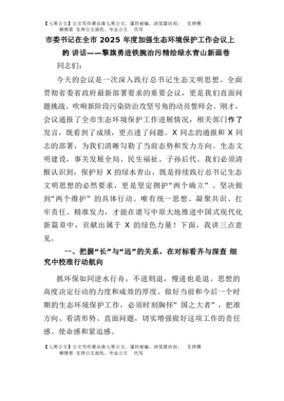 【七哥公文】2025年:市委书记在全市2025年度加强生态环境保护工作会议上的讲话——擎旗勇进 铁腕治污 精绘绿水青山新画卷+更多免费公文+VX:QiGeGongWen2024