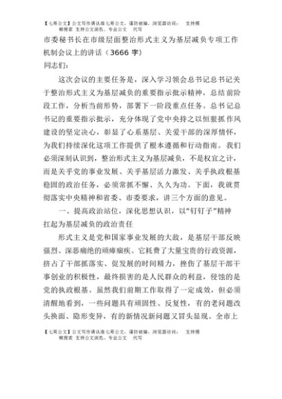【七哥公文】2025年:市委秘书长在市级层面整治形式主义为基层减负专项工作机制会议上的讲话(3666字)+更多免费公文+VX:QiGeGongWen2024