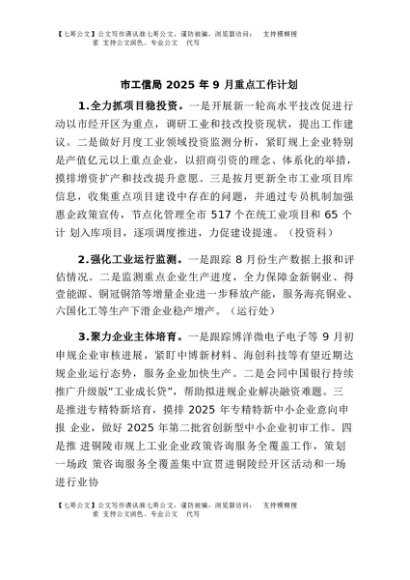 / 【七哥公文】2025年:市工信局2025年9月重点工作计划+更多免费公文+VX:QiGeGongWen2024