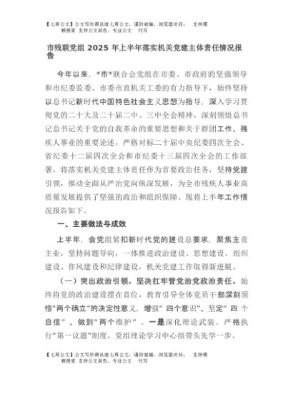 【七哥公文】2025年:市残联党组2025年上半年落实机关党建主体责任情况报告+更多免费公文+VX:QiGeGongWen2024