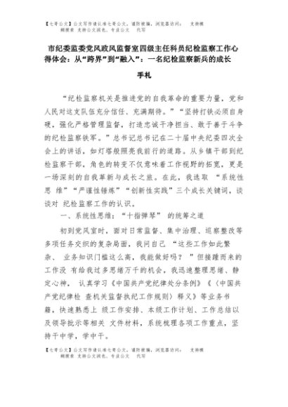 【七哥公文】2025年:市纪委监委党风政风监督室四级主任科员纪检监察工作心得体会:从“跨界”到“融入”:一名纪检监察新兵的成长手札+更多免费公文+VX:QiGeGongWen2024