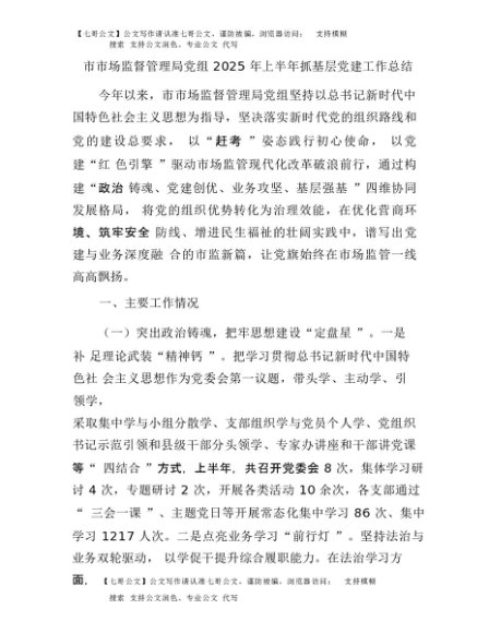 / 【七哥公文】2025年:市市场监管局2025年上半年抓基层党建工作总结+更多免费公文+VX:QiGeGongWen2024