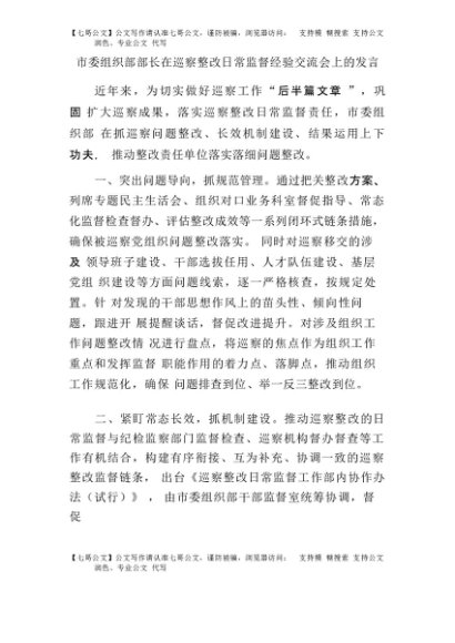 【七哥公文】2025年:市委组织部部长在巡察整改日常监督经验交流会上的发言+更多免费公文+VX:QiGeGongWen2024