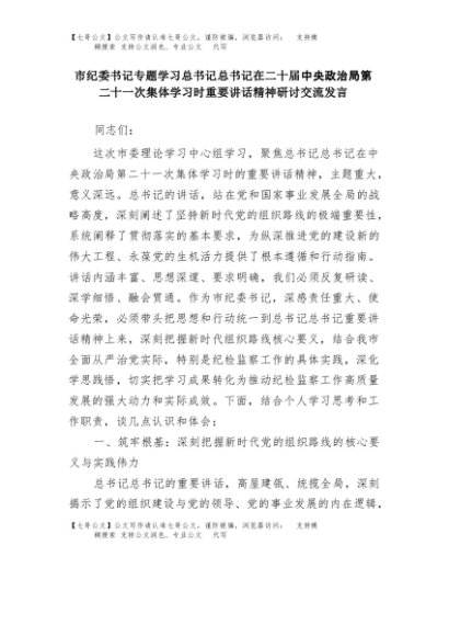【七哥公文】2025年:市纪委书记专题学习总书记在二十届中央政治局第二十一次集体学习时重要讲话精神研讨交流发言+更多免费公文+VX:QiGeGongWen2024