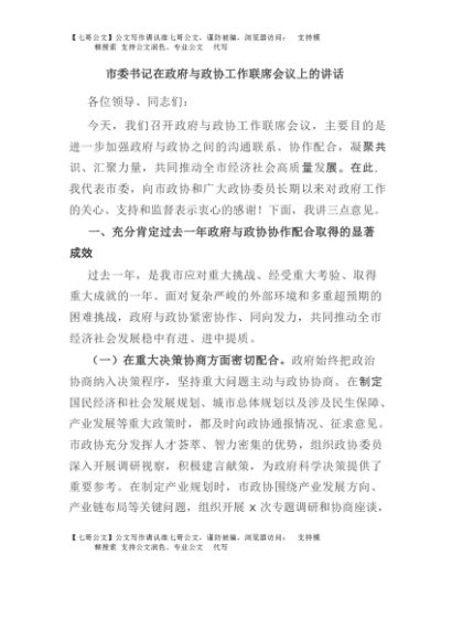 【七哥公文】2025年:市委书记在政府与政协工作联席会议上的讲话+更多免费公文+VX:QiGeGongWen2024