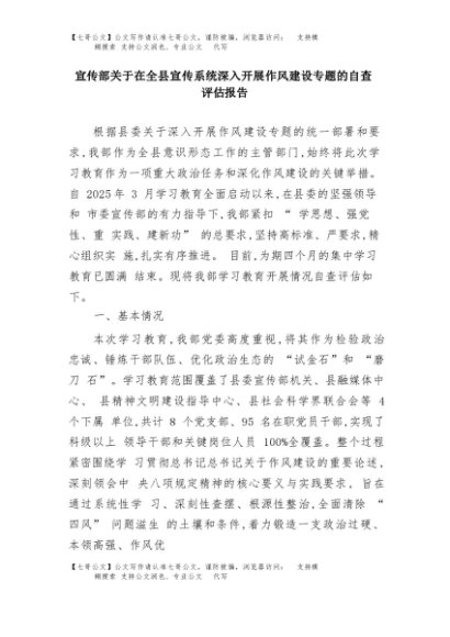 【七哥公文】2025年:宣传部关于在全县宣传系统深入开展作风建设专题的自查评估报告+更多免费公文+VX:QiGeGongWen2024