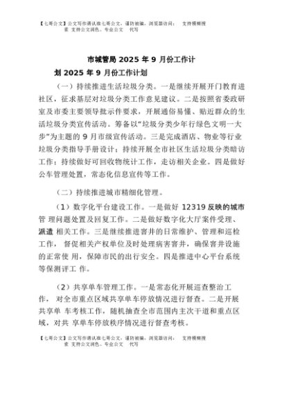 / 【七哥公文】2025年:市城管局2025年9月份工作计划+更多免费公文+VX:QiGeGongWen2024