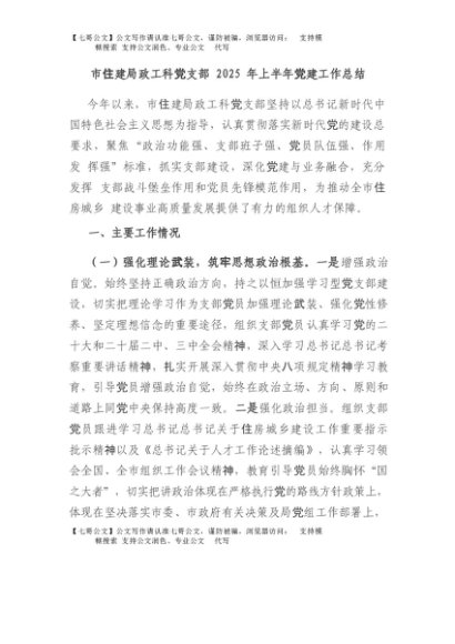 【七哥公文】2025年:市住建局政工科党支部2025年上半年党建工作总结+更多免费公文+VX:QiGeGongWen2024
